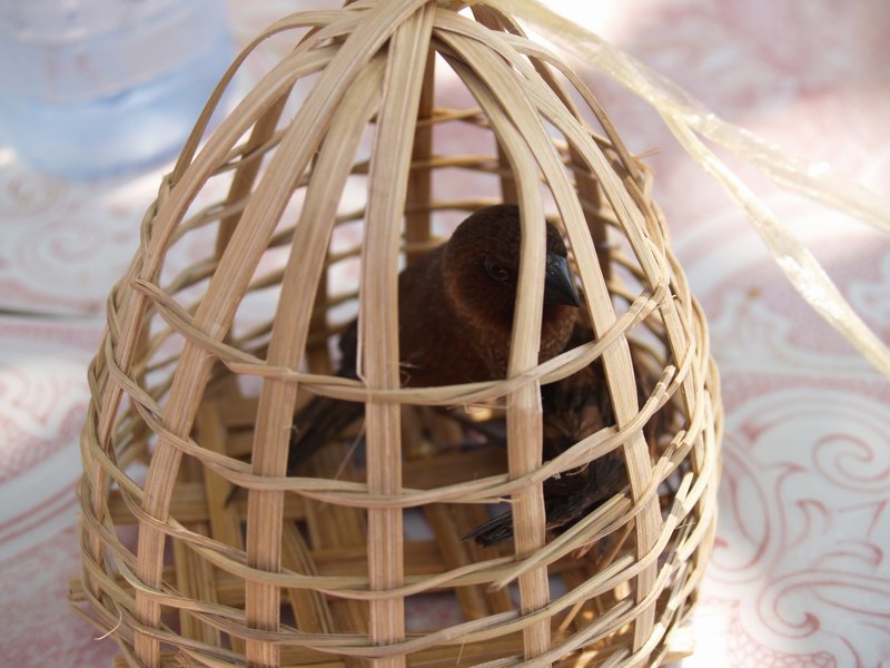 | 小鳥が入ってる。高いけど、逃がしてあげなければならない。そんな心理につけ込んでるな。いや、ふつうに飛ばせることがうれしいんだけど。 | ルアンパバーンの街 | |